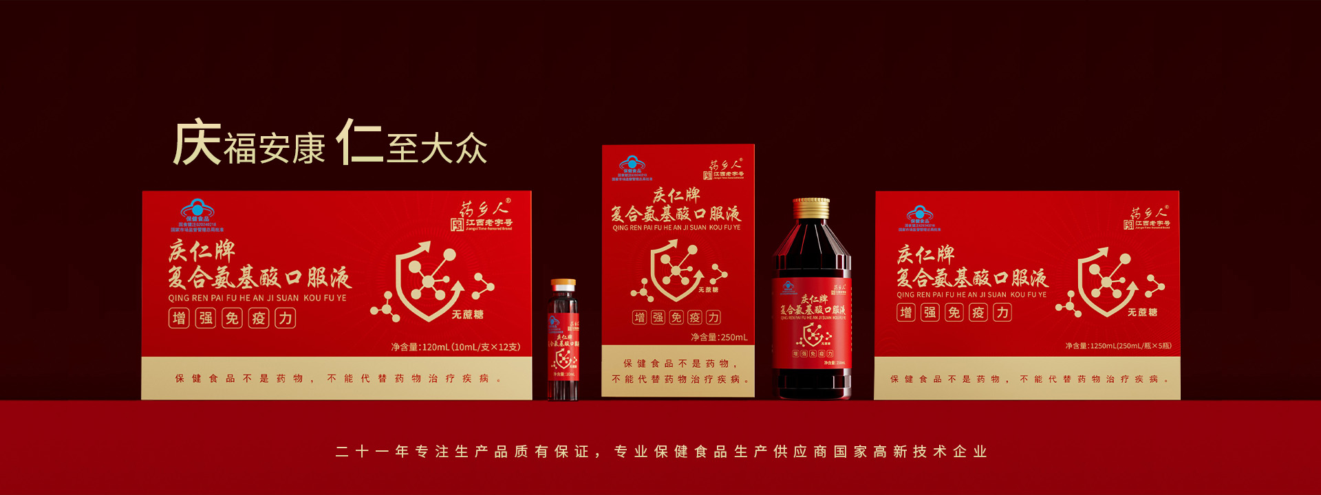 江西樟樹市慶仁保健品有限公司成立于2004年1月18號(hào),注冊(cè)資金2600萬元,是一家專業(yè)致力于保健食品和營(yíng)養(yǎng)食品研發(fā)、生產(chǎn)、銷售為一體的現(xiàn)代企業(yè)。公司現(xiàn)有保健品批文:藥鄉(xiāng)人牌黃芪當(dāng)歸阿膠口服液。慶仁牌蛋白質(zhì)粉,慶仁牌鈣鐵氨基酸口服液、慶仁牌牦牛骨茯苓山藥核桃維D顆粒、阿膠枸杞顆粒、復(fù)合氨基酸、西洋參淫羊霍酒、慶仁牌鹿茸人參酒、慶仁牌鈣維生素D咀嚼片、慶仁牌葡萄糖酸鋅口服液、葡萄糖鈣口服液、硒口服液,硒片等自有批文二十二個(gè),正在申報(bào)的保健品批文十六個(gè),同時(shí)擁有普通食品生產(chǎn)線、固體飲料其他飲料、配置酒、壓片糖、消殺劑生產(chǎn)線。我們的專業(yè)品質(zhì)保證...